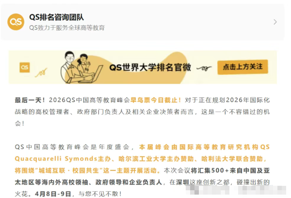 但是在1月28日QS世界大学排名官微就自曝4月8日-9日,将举行QS中国高等教育峰会,由国际高等教育研究机构QSQuacquarelli Symonds主办、哈尔滨工业大学主办赞助、哈利法大学联合赞助,将围绕"城域互联.校园共生"这一主题开展活动。本次会议将汇集500+来自中国及亚太地区等海内外高校领导和企业负责人……