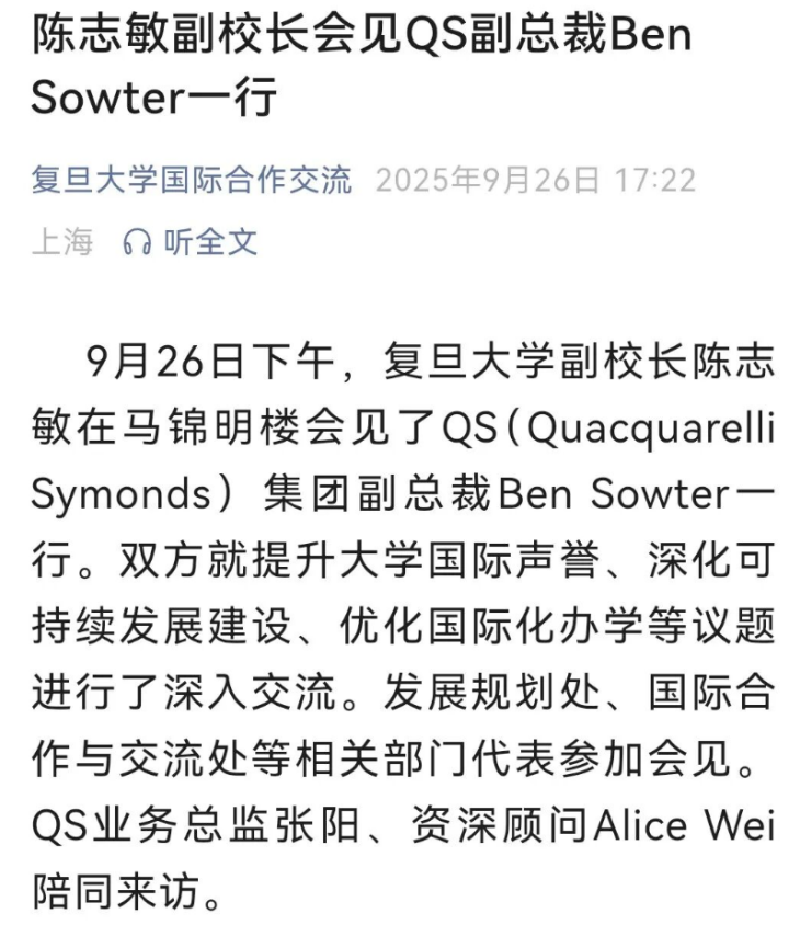 您以为只有哈工大这么做么?当然不是,2025年复旦大学国际合作交流的官方号上也曾经曝光出复旦大学副校长陈志敏会见了QS(QuacquarelliSymonds)集团副总裁BenSowter一行。当然人家干什么来,咱也不知道,不过有网友猜,大概率是来拉赞助的。